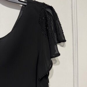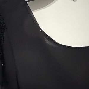Chic black blouse with elegant drape back. Perfect for evening wear or upcoming vacation! Approximately 20” pit to pit and 23.5” shoulder to hem.