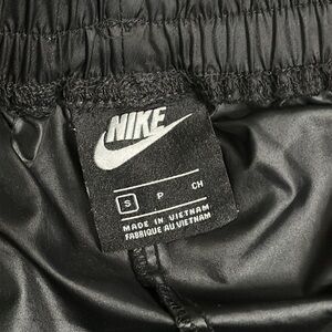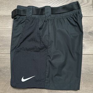 Nike Sportswear Woven High Rise Buckle Belted Black Swoosh Shorts Size Small. Great condition! 100% Polyester. Pull on shorts with elastic waistband, belt loops, and a buckle belt. Front Pockets. White swoosh emblem. See pictures for measurements.