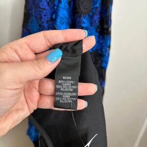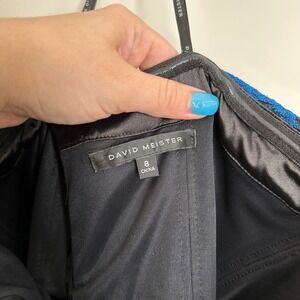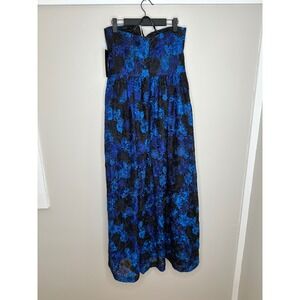 Keywords: David Meister, strapless dress, maxi dress, floral lace dress, cobalt blue dress, formal gown, evening dress, party dress, wedding guest dress, size 8, designer dress, lace overlay, black lining, new with tags, prom,