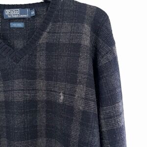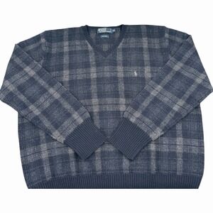 VTG Polo Ralph Lauren Sweater Men 2XL Blue Tartan Plaid V Neck Sweater Knit Pony
