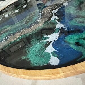 Each piece is uniquely handcrafted by my aunt and uncle in their retirement. My aunt, whose artistic passion shines through in every pour, creates these stunning fluid designs, while my uncle, a skilled craftsman, restored and prepared the wooden serving tray. At 21" in diameter and 2" deep, it's perfect as a functional centerpiece or wall art.