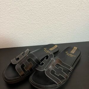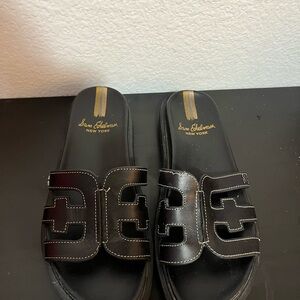 Elegant black slides with gold detailing. Ideal for everyday style. Slight pulling on thread as pictured