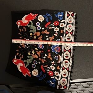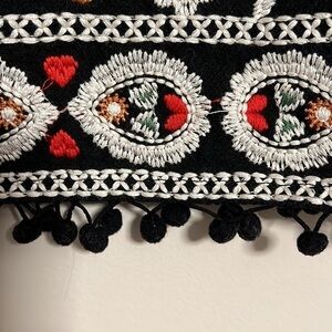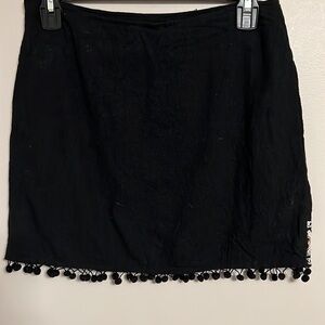 Umgee Womens Size S Black Embroidered Bird Floral Mini Skirt Pom Pom Hem