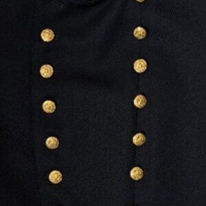 Classic structured fit, high collar, and striking gold crest buttons