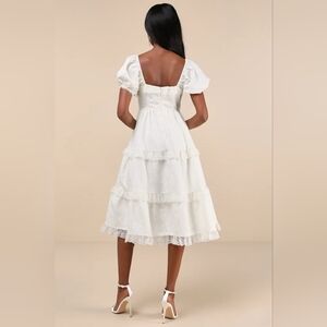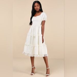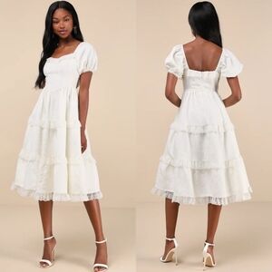 Lulus Gorgeously Romantic Ivory Lace Puff Sleeve Tiered Midi Dress M Wedding. New without tags. See all pictures for details.