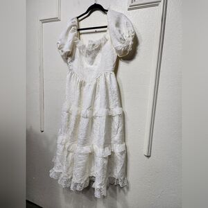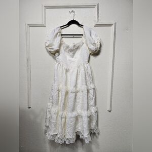 Lulus Gorgeously Romantic Ivory Lace Puff Sleeve Tiered Midi Dress M Wedding
