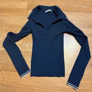 This top is in amazing condition! It’s a pretty navy blue color and is a ribbed collared style. It’s super soft and stretchy and has no flaws. Tagged size XS but can fit size small.