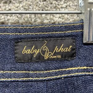 This product is a rare pair of vintage Y2K Baby Phat jeans, made in the USA. The jeans feature a unique lace-up closure, gold chain zip-up, and a flared style with tasseled and studded accents. The jeans are a size 13 with a 34-inch waist and 32-inch inseam, crafted from a dark wash denim fabric blend of polyester and cotton. The jeans are adorned with various embellishments such as lace, sequins, and embroidered designs, embodying a retro and hip-hop style from the 90s with a touch of gold detailing. These one-of-a-kind jeans offer both comfort and style for a bold fashion statement.