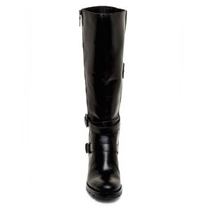 A svelte almond-toe boot cut from smooth leather features a chunky stacked heel and knee-high cut, while a decorative side zipper and wraparound straps add a take-charge touch to the versatile silhouette. A PORON(R)- and memory-foam-cushioned footbed ensures comfort with every step, and genuine shearling lines the foot for cozy warmth.