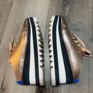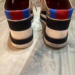 Chic metallic mules with a bold platform. Features lace-up design and contrasting sole. There are some scuffs from wear but in overall good pre-loved condition.
