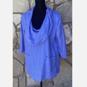 No flaws other than the size tag has been ripped out. This blue linen cowl neck tunic by Soft Surroundings is so pretty and airy. Perfect for summer!