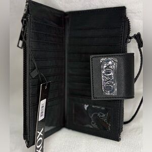 XOXO clutch with monogram design. Sleek black and gray tones.