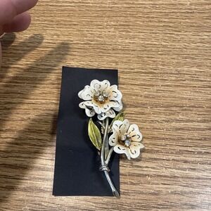 The CORO Vintage White Enamel Flower Brooch features a classic flower shape with cutout petals and adorned with AB rhinestones. Made of enamel in a timeless white color, this vintage brooch exudes elegance and sophistication. The intricate design and craftsmanship of this Coro piece make it a standout accessory for any outfit or occasion, adding a touch of vintage charm to your ensemble.