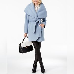 Elegant light blue pea coat by Tahari. Features a wide collar and belted waist. Perfect for stylish layering. Worn twice , in excellent condition.