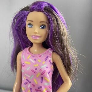 Sparkling charm defines this Barbie doll, ready to bring joy to any collection! She features playful purple streaks woven through her long brown hair and captivating blue eyes. The doll sports a delightful pink dress adorned with a colorful sprinkle pattern and a trendy pair of crisp white boots. Perfect for imaginative play, this Barbie can add a touch of fun to any Barbie collection, enhance creative storytelling, or stand out as a charming display piece.