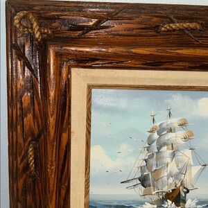 Beautiful painting of a ship sailing in a turbulent sea, typical of mid-20th century maritime art. Set in an ornate rustic wooden frame with rope accents Potentially by Amos Carr. Already phase wire attached for hanging. Perfect for any collector or nautical decor.