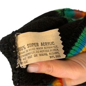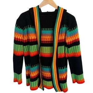 Vintage acrylic multi-color open front hooded cardigan sweater. Brand unknown. In very good used condition; gently worn, no flaws.