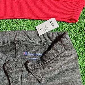This Champion kids' set features a vibrant red sweatshirt paired with cozy gray pants. Perfect for active days, this set combines comfort and style effortlessly.