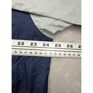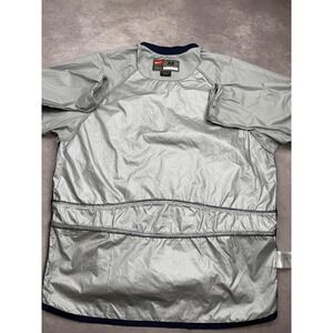 Colorway: Navy blue main body with silver gray sleeves and sides. Ribbed navy collar, elastic cuffs, and zippered sides for easy wear and ventilation.