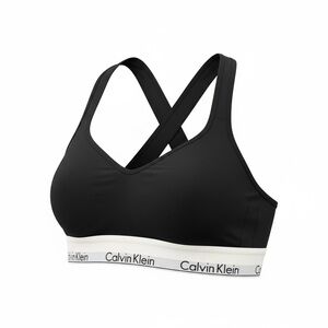 Sleek black bralette with a stylish cross-back design. Features a white band with Calvin Klein logo. Ideal for comfort and support.