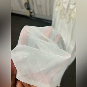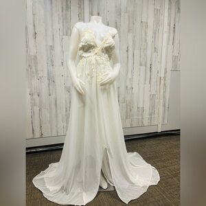 One of a kind up cycled wedding dress with added sheer train and lace accents. The dress fits a 38-40” bust and up to 35” waist. There’s a zipper closure in the back with decorative buttons. Super long train makes it a perfect non traditional wedding dress, maternity dress or a photo shoot piece.