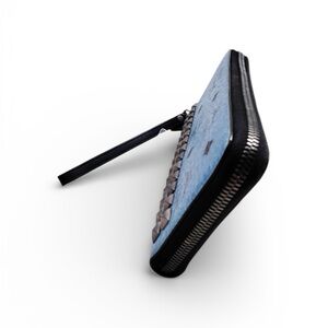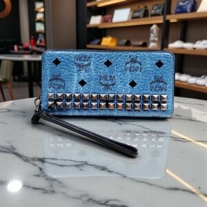 Chic MCM wallet in denim blue. Adorned with silver-tone studs. Includes a handy wrist strap.
