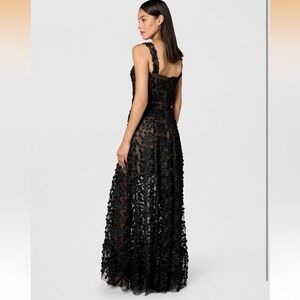 Chic black lace maxi dress. Features intricate lace overlay. Ideal for formal events.
