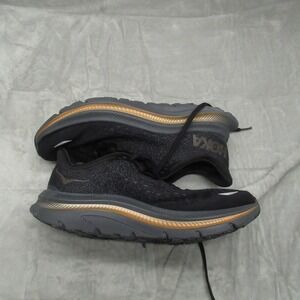Women's Hoka One One Kawana running shoes in black with gold accents. These athletic sneakers feature a breathable mesh upper and a responsive sole designed for comfort and performance. Perfect for your daily runs, gym workouts, or casual athletic wear.