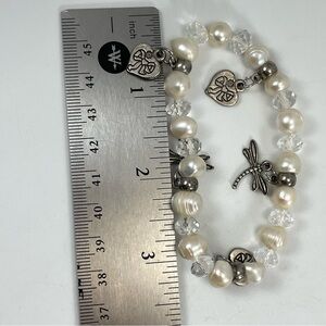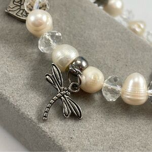 Stunning Unsigned Freshwater Pearl with Dragonfly and Cross Charm Stretch Bracelet