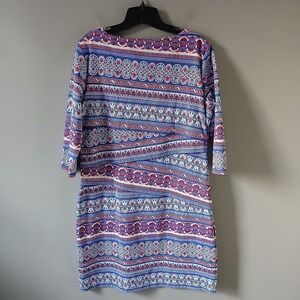 The J. McLaughlin Women's Size XL Dress is a classic and preppy knee-length dress made from a comfortable blend of nylon and spandex jersey fabric. Featuring a round neck and 3/4 sleeves, this dress is perfect for casual occasions in the summer, fall, or spring. The striped pattern adds a stylish touch to this sheath dress, while the layered accents give it a unique and fashionable flair. Designed for a regular fit, this hand wash only dress is a versatile addition to any woman's wardrobe.
