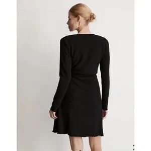 Madewell Ribbed Knit Wrap Mini Dress in black #NI685. Size XS. A mini wrap dress with a body-skimming fit. With fitted sleeves and a self-tie, it's sexy meets comfy.