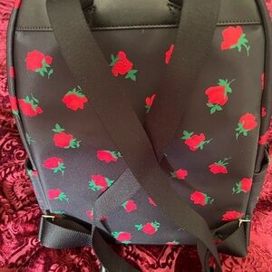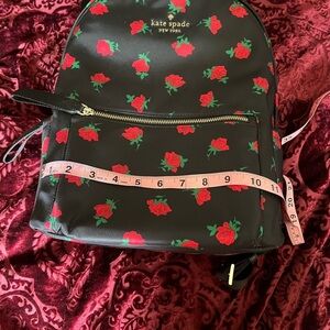 Elegant black backpack with striking red rose pattern. Iconic Kate Spade style. One big zipper pocket on the back, one slip pocket on each side. The roomy inside boasts one large slip pocket, one zipper pocket and a couple card size slip pockets in gorgeous black logo print fabric. Adjustable straps. New condition.