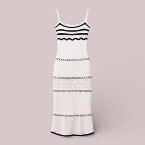 Stylish midi dress with black and white stripes. Features intricate knit patterns and is the perfect spring/summer bodycon midi.