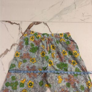 Chic pants with vibrant floral design. Features yellow, green, and pink flowers on a blue background.