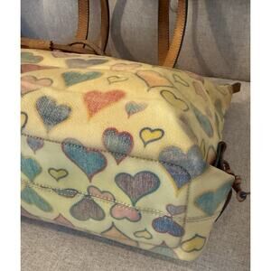 The Vintage Dooney & Bourke Sweetheart Collection Scribble Heart Charm Shoulder Bag is a medium-sized satchel/top handle bag with a zip closure and brown leather handles/straps. The exterior features a multicolor heart pattern, gold hardware, and a canvas lining in beige. This charming bag also includes a bag charm accessory, making it a stylish and unique choice for women looking to add a touch of nostalgia to their accessory collection.