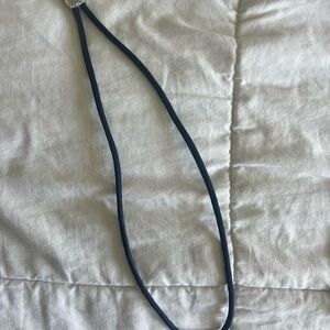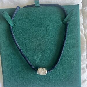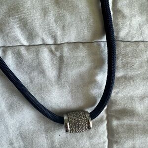 A soft nylon paracord in deep marine blue, secured with a lab white sapphire slider for maximum versatility. Adjust the necklace to wear it long and layered, or cinched as a true choker. A lab white sapphire pendant is the finishing detail, elevating paracord into a piece that is at once effortless and sophisticated. Comes with box - in excellent condition.