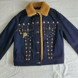 Trendy denim jacket featuring a faux shearling collar. Embellished with gold and silver accents for a chic look.