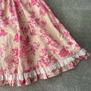 Charming floral dress with pink and cream hues. Features lace trim and puff sleeves.