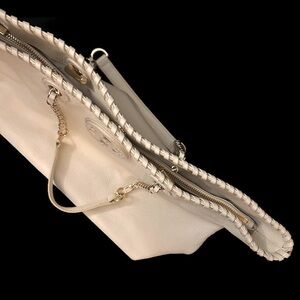 This is an authentic Tory Burch Marion Tote, originally purchased for $595. Genuine leather. Cream color with gold-tone hardware. Small chevron logo, whipstitch top, chain straps and magnetic closure. Interior has a middle zipper compartment, a zipper pocket on one side and two slip pockets on the other. Bag measures 18” x 10” x 5” with an 8” handle drop. The straps are long enough to wear over your shoulder. Very good used condition - both the exterior and interior are very clean and the straps are in great shape. Will ship in the original cloth Tory Burch bag it was sold in.