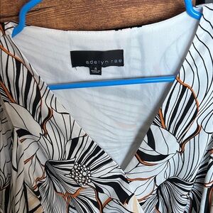 Stylish romper with bold black and orange leaf pattern. Features cold shoulder design. Perfect for a chic look.