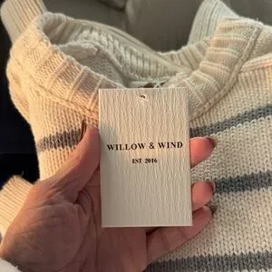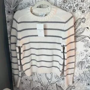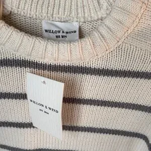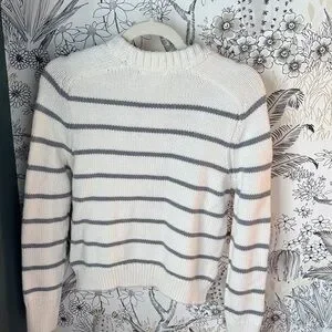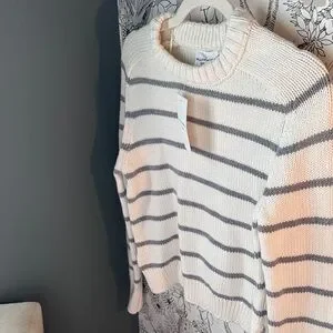 Elevate your wardrobe with this elegant striped sweater in cream and gray. Perfect for layering and adding a touch of sophistication to your casual look.
