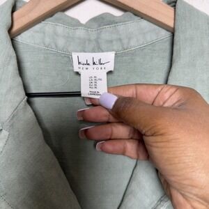 Nicole Miller Women 100% Linen Sweater Green Henley Lagenlook Coastal Minimalist