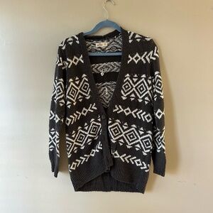 Chic Gray and white cardigan with geometric design. Perfect for layering. Adds style to any outfit. Loved wearing this during the fall and Christmas!!