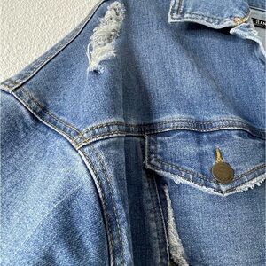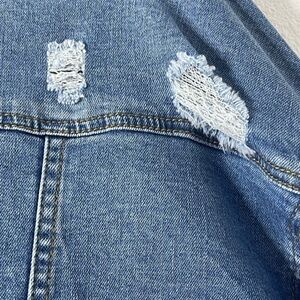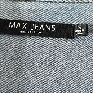 NWOT MAX JEANS WOMEN BLUE DISTRESSED DENIM JEAN JACKET LONG SLEEVE SIZE SMALL JACKET IS OVERSIZED FITS UP TO A LARGE THE POCKETS ARE STILL SEWN SHUT PERFECT CLOTHING PIECE FOR FALL WEATHER ๐๐ JACKET DOES HAVE STRETCH TO IT ๐