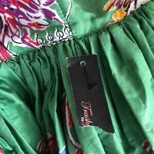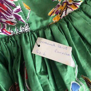 'Gathered Skirt' from Trashy Diva in the most wonderful print! This design draws its inspiration from classic 1950s styles. It has a high, wide waistband and a dramatic full skirt with 8 panels of gathering. The print is wonderful- it's the reason why I bought this skirt even though it was a size too small for me! It's called 'Carnival' and was a limited release, available on only a few styles during the fall of 2017. It's a 1950s inspired novelty print that captures the magic of Mardi Gras day. Masked revelers parade through French Quarter streets in a whirl of vibrant color that embodies the true spirit of New Orleans. Woven cotton shell, lined in cotton. Closes with a back zip. Dry clean recommended. New with tags and flawless!