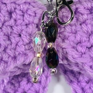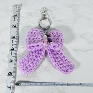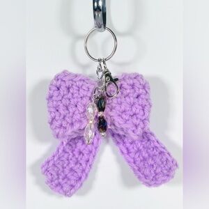 Hand crafted purple crochet bow bag charm keychain with bead accents. Perfect for adding a cute touch to your bags or keys.