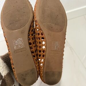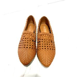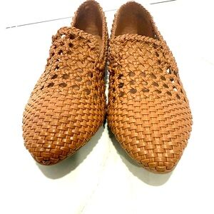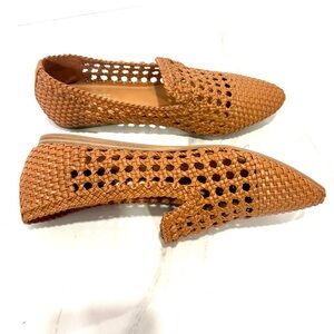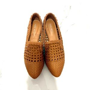 Brand and Style: The shoes are by Nine West and feature a distinctive woven or basket-weave design, often referred to as woven leather loafers.