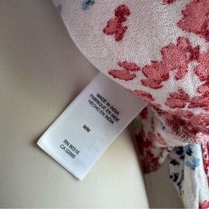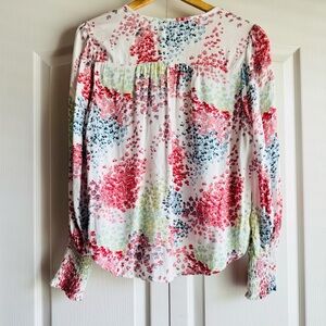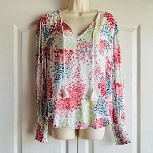 Great condition gentle wear minor repair on shoulder see photo no other flaws. Details; v neck, tassel, floral print, long billowy sleeve with smocked cuff, breathable, lightweight. Material: viscose. Laying flat: pit 21 inches; length 25 inches (longest); pit to cuff 17.5 inches; shoulder 16 inches.