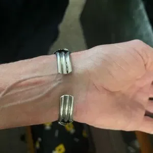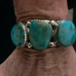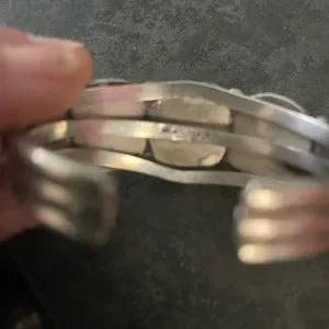 Vintage Native American Turquoise & Sterling Silver Cuff by M Thomas Jr, Navajo. It is a heavy bracelet. Stunning Mediterranean Colored Quality Turquoise with Beautiful sliver designs. It’s in good to excellent vintage condition. I don’t offer or promote.
