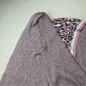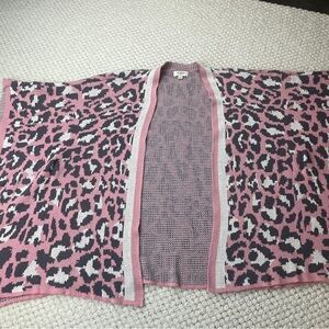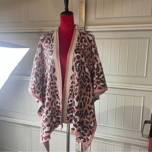 Stylish leopard print poncho. Features pink and black colors. Open front design. Perfect for layering. Pre-owned in good condition.